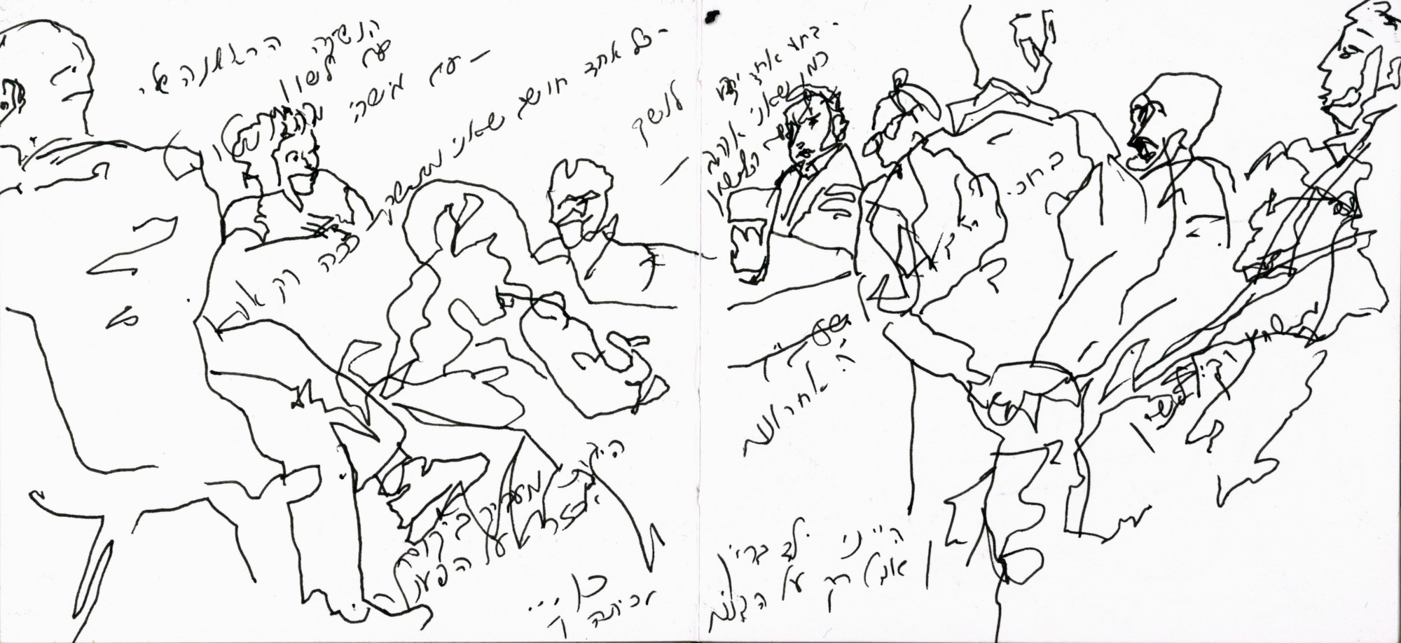 במרכז האירוע, פרפורמרים לבושים חגיגית יושבים סביב שולחן ומתוודים.